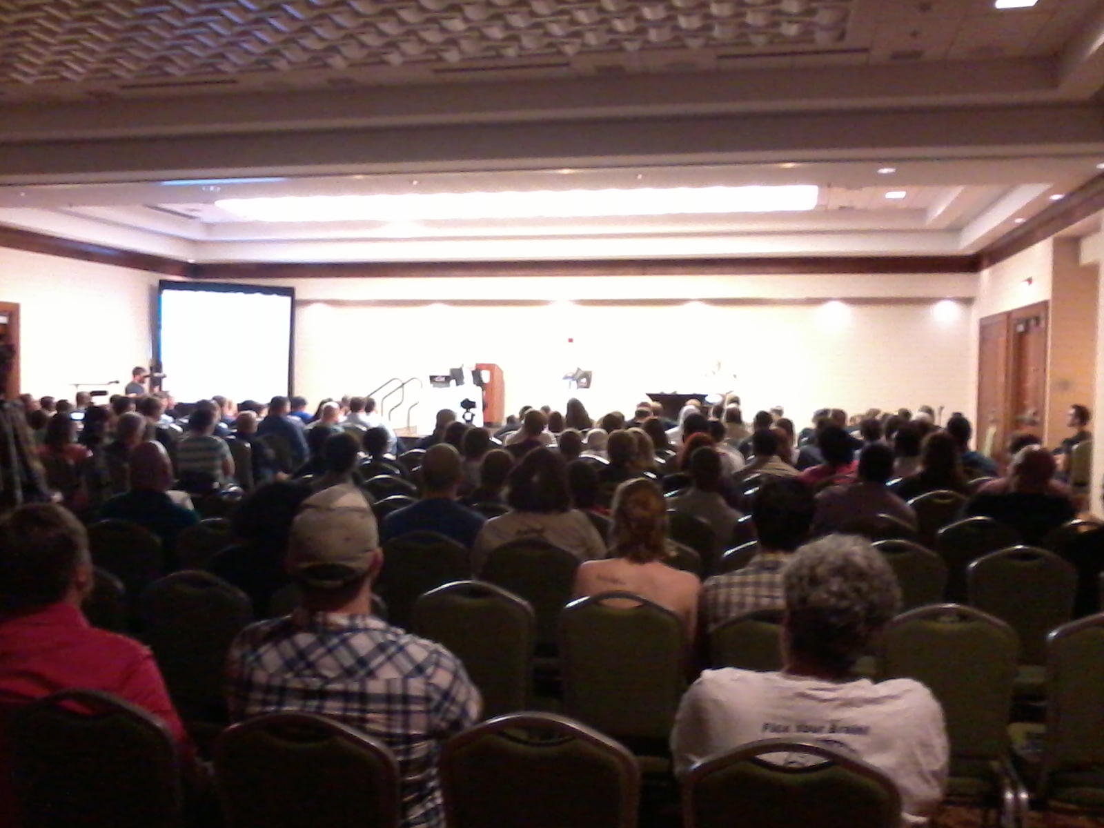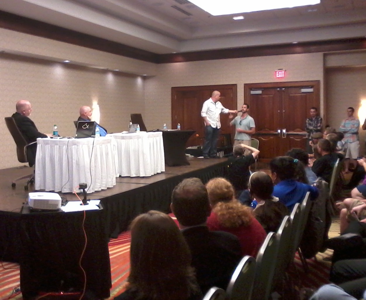 IMG_20140531_203000The hotel was nice, the beer was cold and not watered down, the merchant booths were busy, anticipatory conversations about the debate could be overheard all around, the auditorium filled quickly, and the make-shift stage was set – complete with sound, video, lights, props, an overhead projector, and debate opponents poised to reason and retort.  Both opponents were afforded ten minutes of opening statements, ten each of rebuttal, followed by several segments of back-and-forth, then 35 minutes of Q&A, and finalizing with 2 to 5 minute closing remarks.  Bruggancate started first, giving Dillahunty the final remarks.  Bruggencate made several classic presuppositional points and (what this observer would call) circular arguments full of logical fallacies.  He used many video clips of Dillahunty from various media over the years, and seemed to be attempting to shift the burden of proof from the position of the supernatural claimer to requiring skepticism to prove the logic of the universal negative.  Dillahunty offered what also might be considered classic atheist arguments and already anticipated his opponent’s arguments so well as to have relevant and applicable rebuttal written beforehand, and giving the crowd a brilliant demonstration of the principle of Occam’s razor.