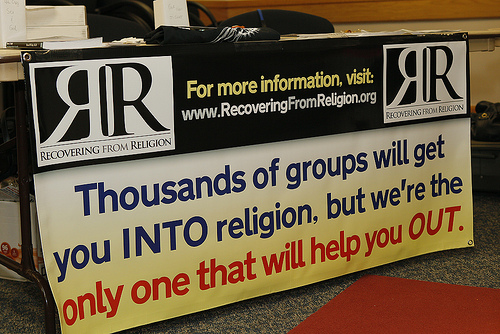 RR booth bannerBilled as a “Refining Reason” debate, this event was sponsored by Recovering From Religion, and was also attended by such special guests as American Atheists President David Silverman (http://www.atheists.org/about-us/board-of-directors) and Creation Today President Eric Hovind (http://www.creationtoday.org/about/eric-hovind/). (Other news and interesting development from the debate event include an announcement from American Atheists President David Silverman that their 2015 national convention is to be held at the Peabody Hotel in Memphis, TN on Easter weekend, April 3-5).  A VIP dinner and post-debate reception were also on the agenda and many booths were present representing everyone from Apostacon to “The God Virus” author, Dr. Darrel W. Ray.  Host of the show, Dogma Debate, David Smalley was in attendance giving both a pre-debate presentation entitled “Learning To Love Your Enemy,” and serving as moderator of the debate between Bruggencate and Dillahunty.  Smalley also recorded a live broadcast of Dogma Debate on stage in the debate hall as a bonus session after the debate – for which Silverman, Hovind, Bruggencate, and Recovering From Religion’s Sarah Morehead engaged post-debate discussions with Smalley and members of the audience.  That broadcast can be heard at this link: