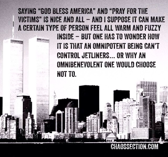Saying “God bless America” and “pray for the victims” is nice and all—and I suppose it can make a certain type of person feel warm and fuzzy inside—but one has to wonder how it is that an omnipotent being can’t control jetliners… or why an omnibenevolent one would choose not to.