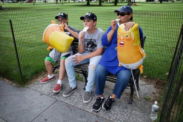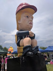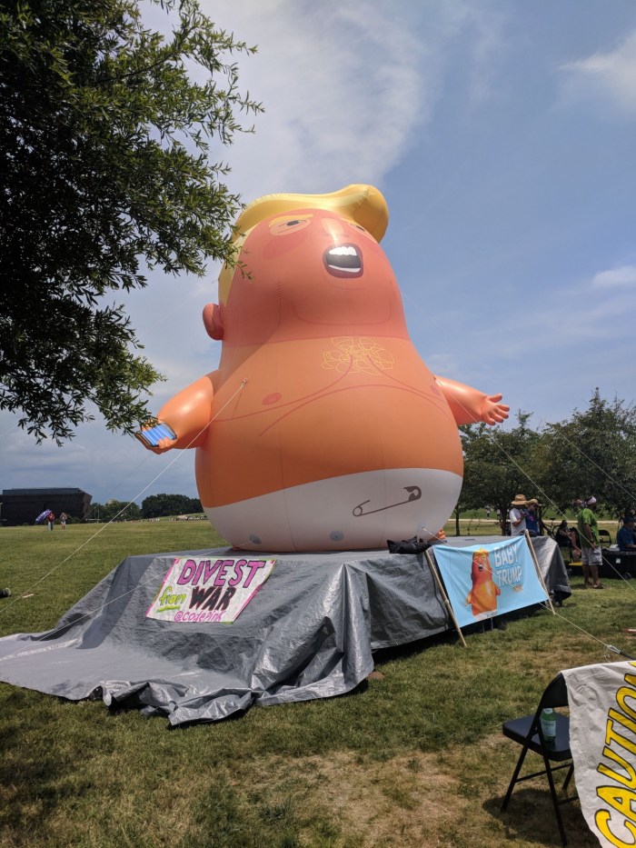 Once Lou and I reached the event, we were greeted by a large likeness of Trump tweeting from a toilet, complete with audio which consisted of various gems like “I am a stable genius,” sprinkled in with an occasional long, loud farting noise. The beloved “Baby Trump Blimp” was there, too (which had to be tied to the ground because, well, “freedom”). The atmosphere for the most part was light. Of course, you had the random assholes walking over to start their ignorant “build the wall” chants and display some other general buffoonery, but eventually they moved on. Several people spoke: Madea from Code Pink, a John Bolton impersonator—who I have to say pretty much nailed it— and one of my favorites, Lee Camp. If you are not familiar, Lee is a comedian who came up with the Occupy movement and now has a John-Stewart-like show for us lefty radicals on RT.