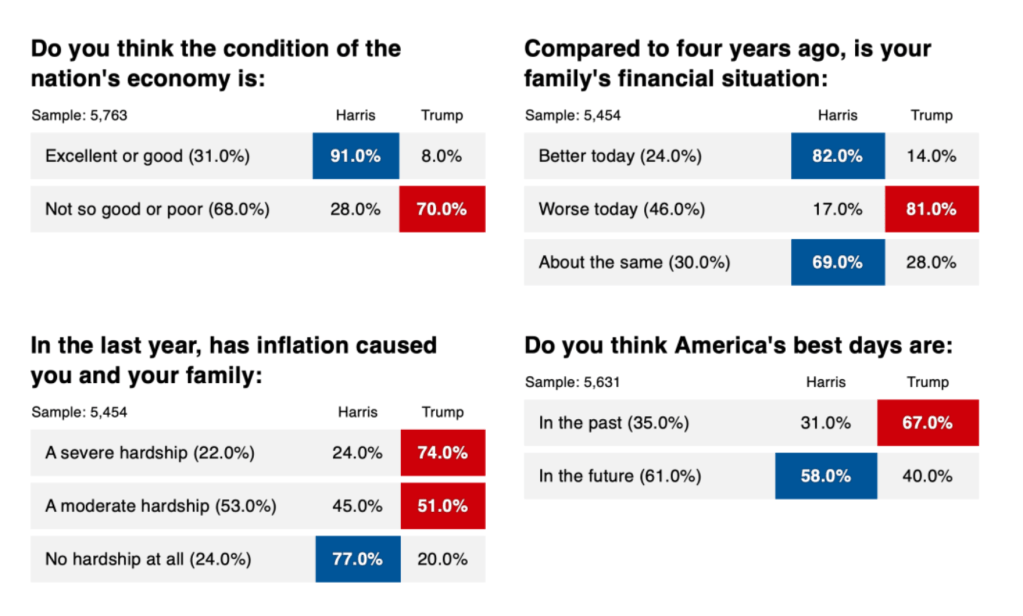 Exit polls reveal the urgency of this sentiment. Over two-thirds of voters described the economy as “poor,” and the vast majority of those who did backed Trump. More voters said they were worse off financially than four years ago, and eight in ten of those voters chose Trump. Inflation, in particular, loomed large: most voters said it was a serious hardship, with nearly a quarter describing it as “severe.” Though Harris led Trump among voters who said abortion should remain legal, Trump still captured 28% of these votes, indicating that for many voters, economic concerns took precedence. In fact, even though more voters found Trump’s views extreme compared to Harris’s, nearly 1 in 10 of those voters backed him anyway—a stark signal that they were seeking any perceived alternative to the status quo.