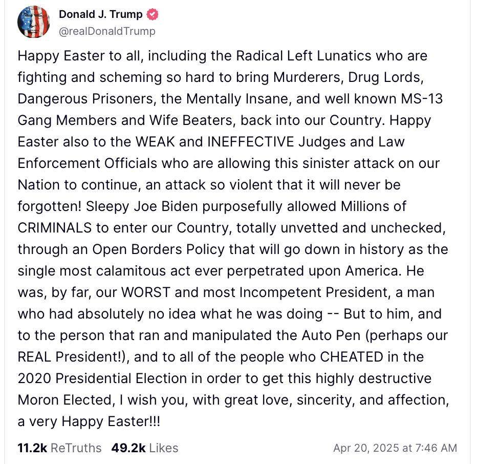 This morning, Donald Trump’s Easter message on Truth Social was a rambling diatribe against “Radical Left Lunatics,” “Mentally Insane” immigrants, “Wife Beaters,” “Weak Judges,” and—of course—the classic finale: a reminder that “Sleepy” Joe Biden is a criminally installed puppet and America is being destroyed by an open-borders conspiracy.